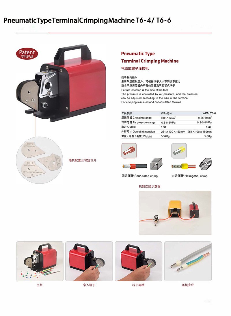 - 气动管状端子压接机 1.传统的固定模具被六角压接模具取代,它可以灵活地压接到管状绝缘端子 2.由于六角形可以无级调整。压接规格可在 0.08-6mm 范围内自由设置。 3.压接后,端子呈六边形外观美观,无任何飞边 描述 T6-4 应用 范围压接 管状端子 0.08-10mm2 输出力 1.3T 适用气压 0.3-0.8MPa 外部尺寸 251mm*100mm*150mm 重量 5.52kg
